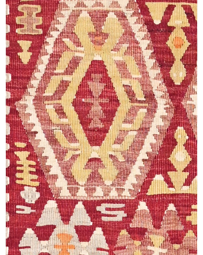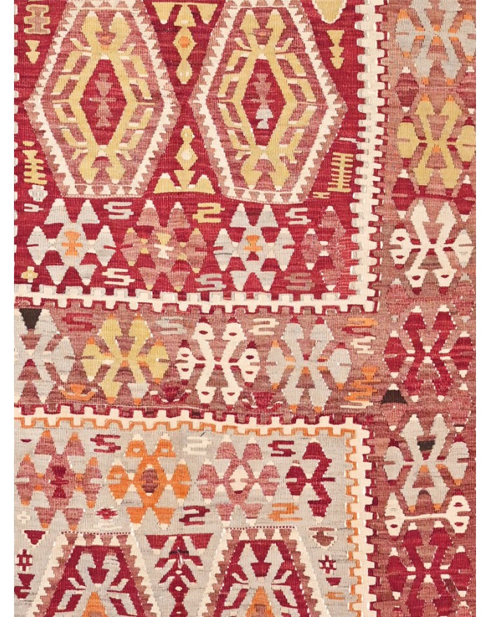 Kilim rugs from the Eşme region are woven with medium wools and the warps are often cotton. These kilims are usually decorated with hexagonal medallions surrounded by small filling or tree-of-life motifs. The colors used are generally quite bright and have faded over time. Eşme kilims are always woven in one piece.