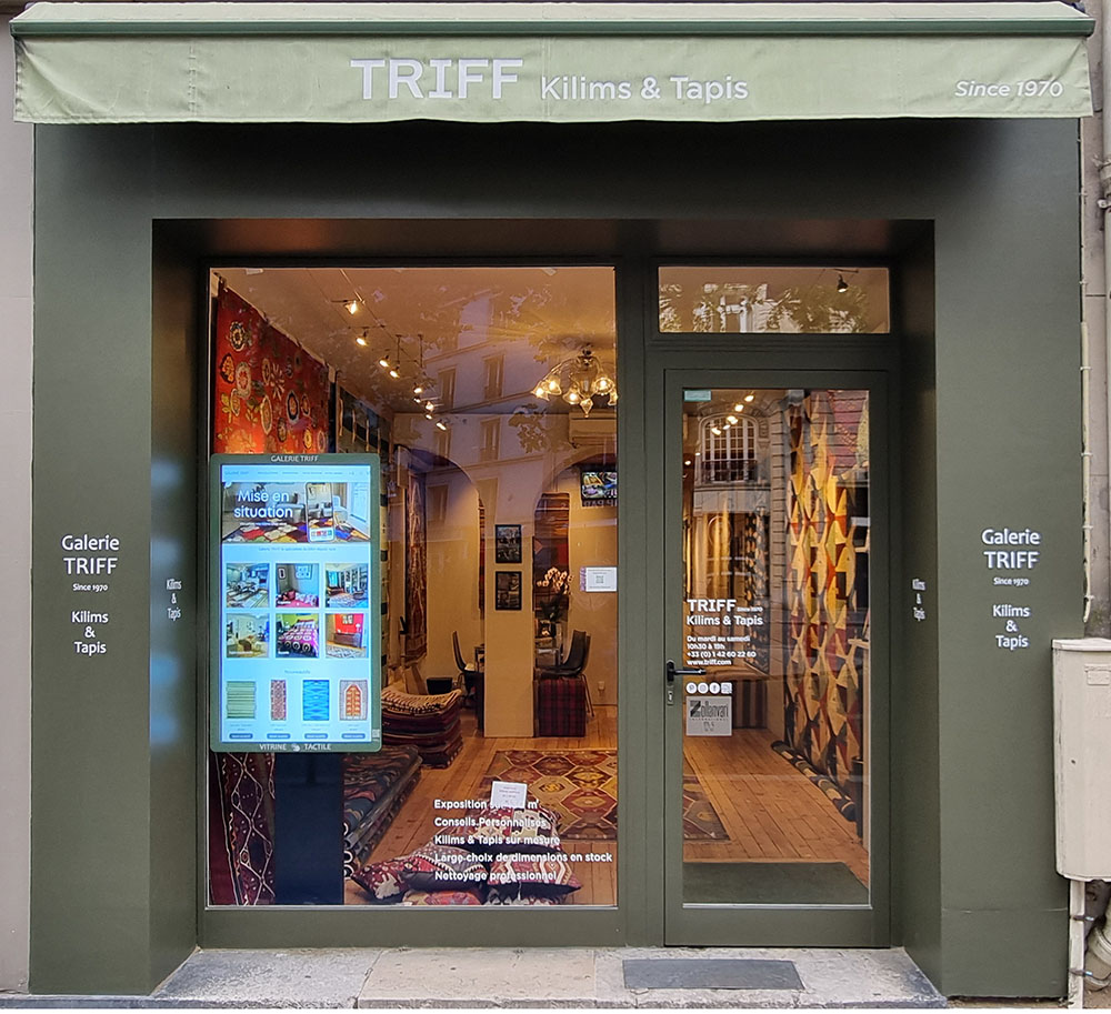 Au cœur du quartier de la décoration, au 13 boulevard Raspail dans le 7eme arrondissement de Paris venez découvrir notre galerie. Faite le plein de couleurs dans notre espace de 130 m2 découvrez notre magnifique collection de tissages, tapis et kilims. Bienvenue dans l’univers de la Galerie TRIFF, où chaque pièce est une épopée tissée, un récit de culture, d’histoire et d’art. Depuis les années 70, nous avons dédié notre cœur et notre énergie à l’exploration et à la célébration de l’art du kilim, ce tissage ancestral qui, bien plus qu’un simple objet, est le reflet d’un savoir-faire, d’une tradition et d’une transmission qui ont traversé les âges.