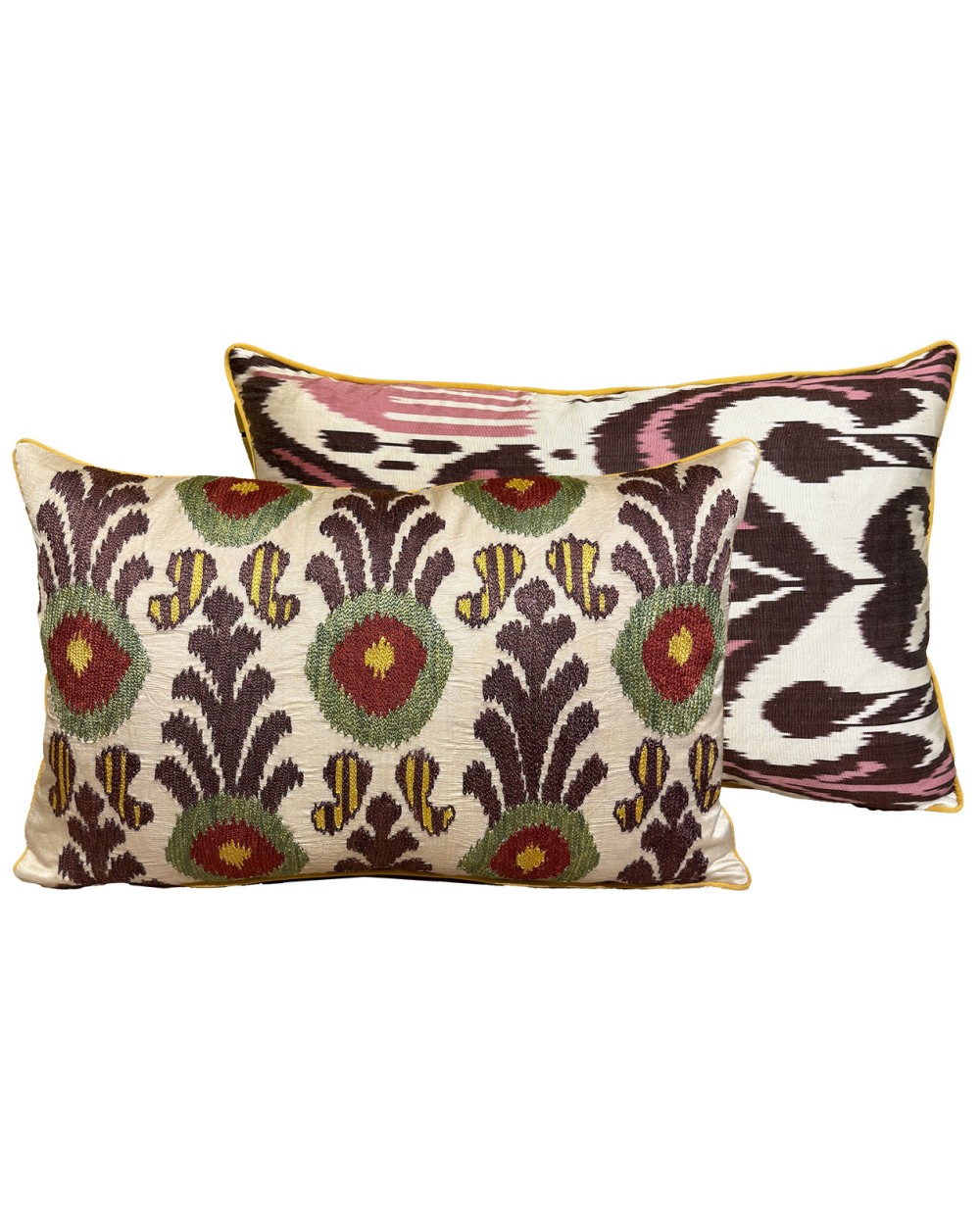 Coussin 100% soie, brodés main et dos en ikat tissé main.