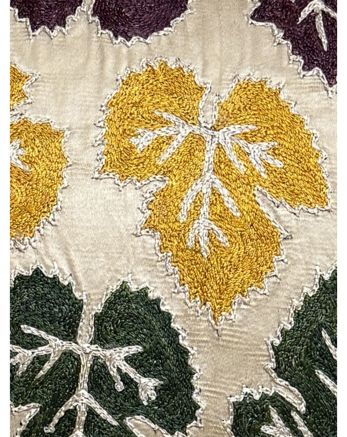 Coussin Suzani, issue d'un savoir-faire ancestral ouzbek, chaque pièce brodée à la main est unique. Le nom vient du mot persan "suzani", qui signifie "aiguille". Ces broderies sont célèbres pour leurs motifs complexes et colorés, souvent composés de motifs floraux et parfois de motifs animaux ou de symboles solaires.