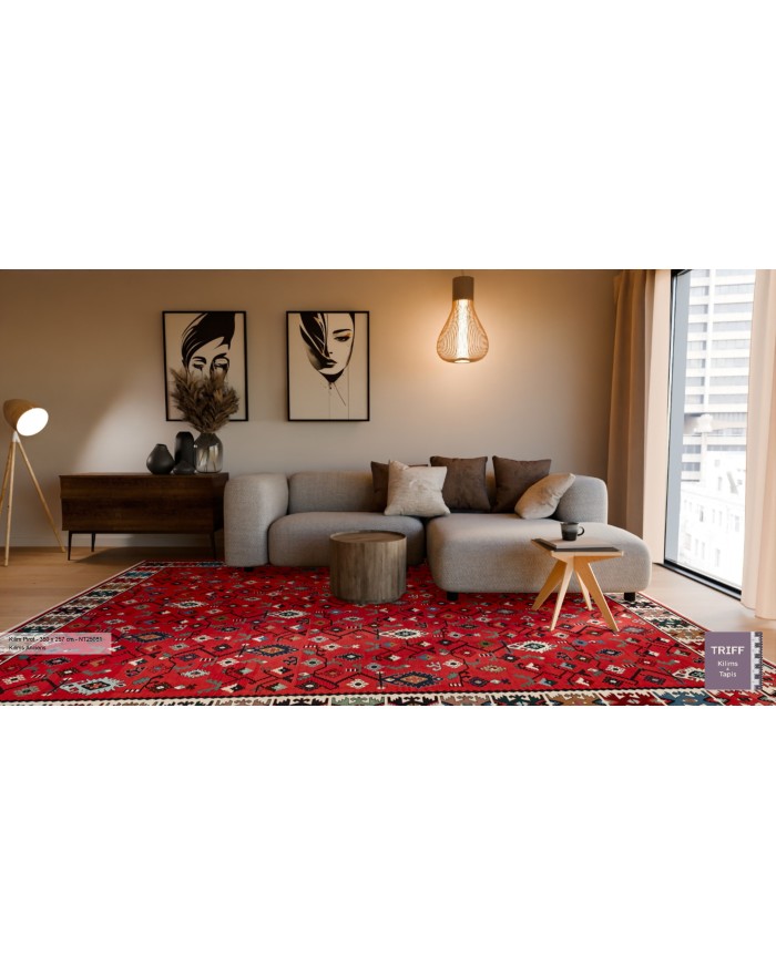 A partir de la fin du 19ème siècle, ces kilims étaient souvent tissés à des fins commerciales. C'est pour cette raison que l'interprétation des motifs va être plus régulière et que l'on va trouver des grandes tailles.